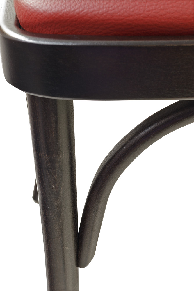 Das Gestell des Stuhls besteht aus Buchenholz in der warmen und natürlichen Holzfarbe American Walnut. Der Sitz ist gepolstert und kann mit Kunstleder, Echtleder oder Stoffbezug ausgewählt werden. Die Rückenlehne besteht aus Sperrholz und ist verstrebt, was dem Stuhl zusätzliche Stabilität verleiht.