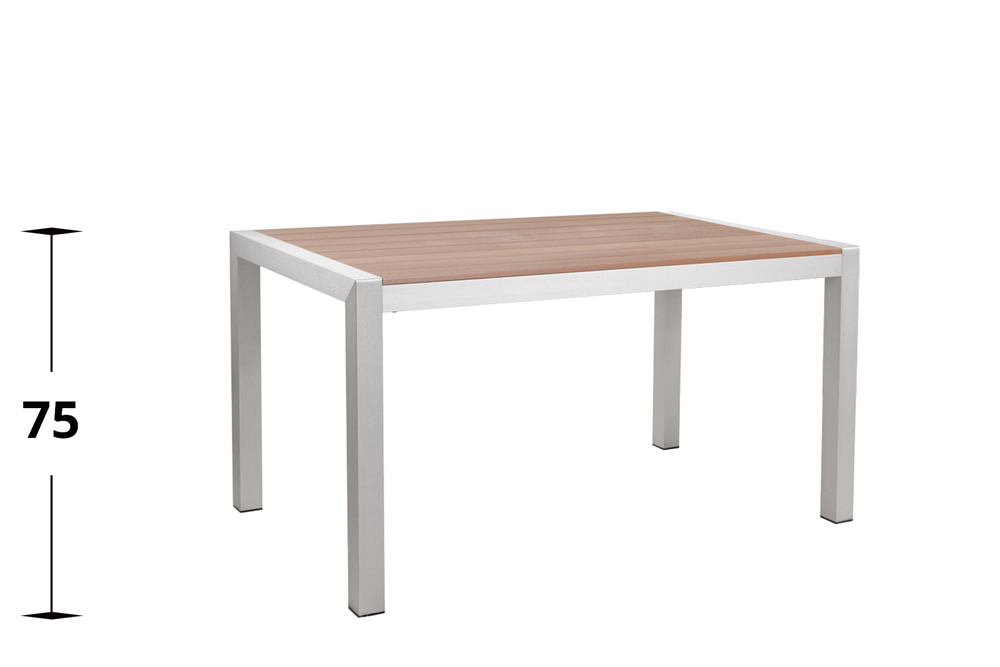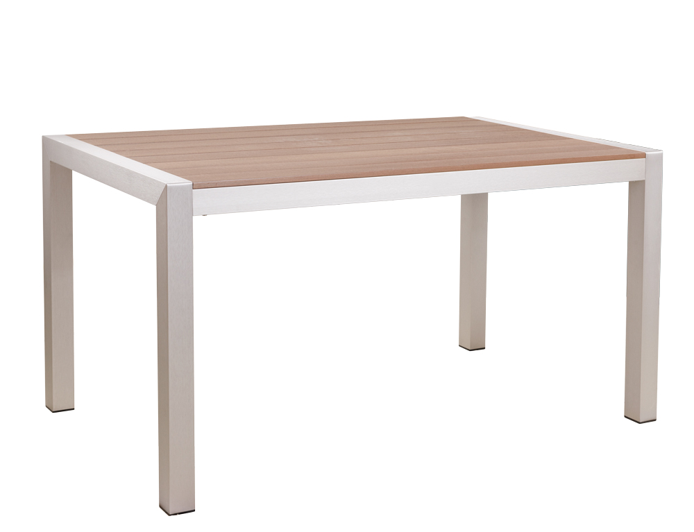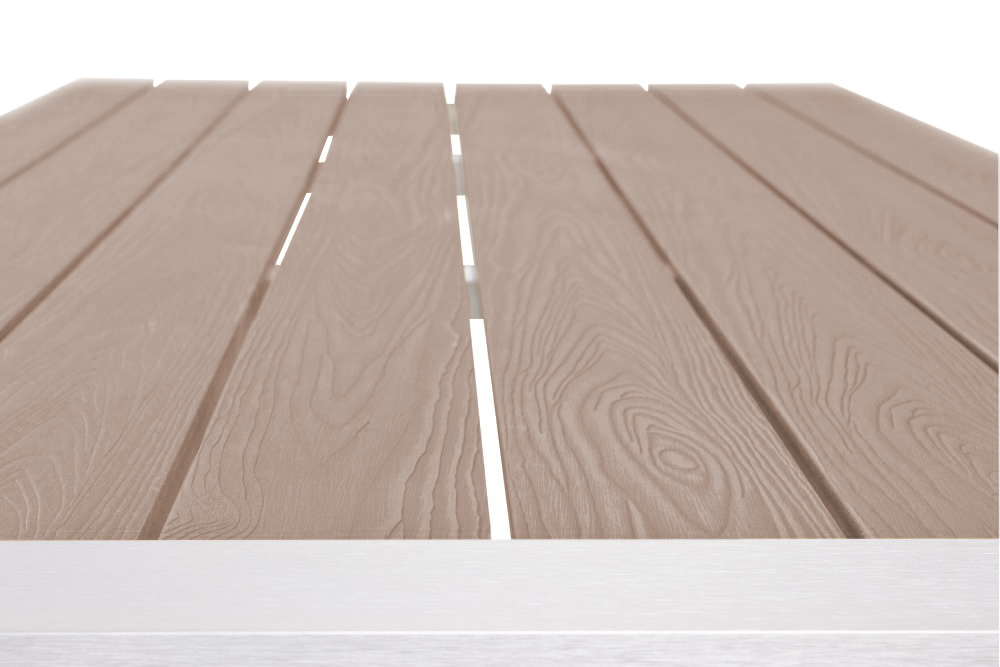 Das Gestell besteht aus gebürstetem Aluminium in Edelstahloptik und bietet eine robuste und rostfreie Basis für die Tischplatte aus Polywood-Lattung.
